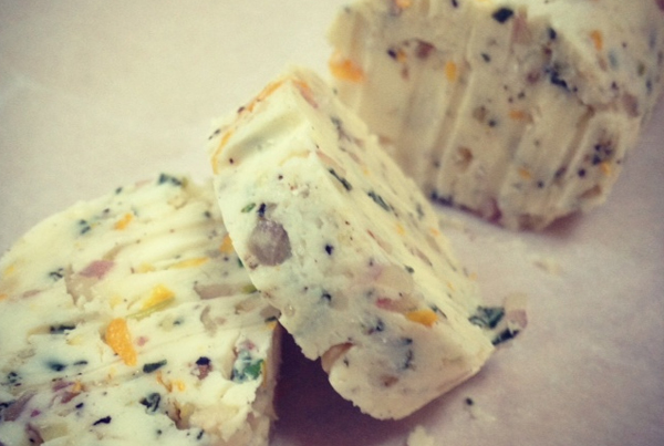 In the biz we call this Compound Butter. Which is basically butter that is flavored and usually rolled into a log.  You can create personalized flavors of this love log and store it in the freezer/refrigerator for when you want to really impress someone, or yourself!  You use this stuff anytime you need a little something special for your meal.  Something that doesn’t necessarily involve fancy cooking techniques or expensive ingredients. Using this stuff really makes you look like a culinary genius, and will certainly impress the pants off anyone, which could or could not be your objective.