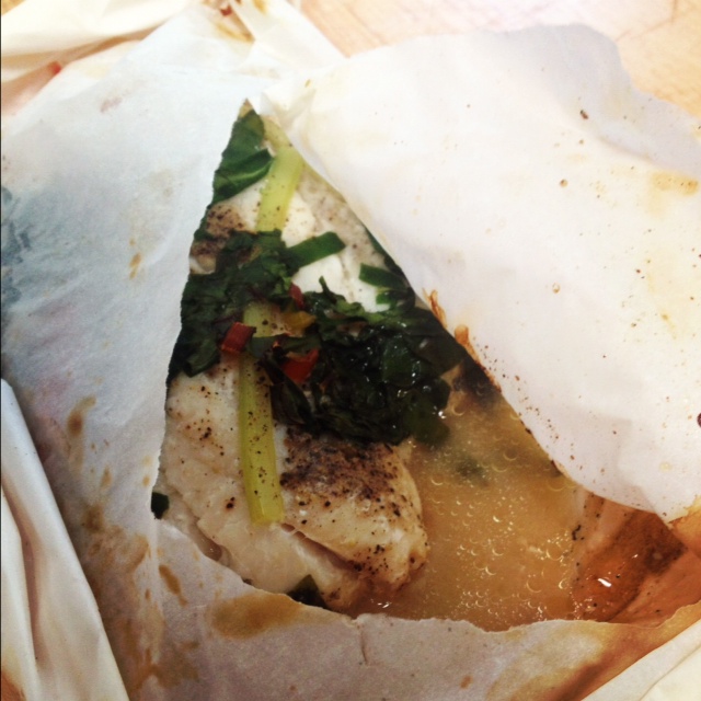 This preparation is one of my favorite single person go to meals. It’s also the equivalent of the ‘one pot meal’. Almost no clean up. It involves preparing, cooking and eating in the same container. Which in this case is parchment paper. If you have never used this baking paper, you really need to run and get some immediately. It’s one of the staples of a properly stocked pantry.(It’s also a great last minute substitute for gift-wrapping paper) It’s a wonderful product because no food will ever stick to it. You could also certainly use foil instead of parchment, but you would have to make sure you lubricate your foil, or use a nonstick.